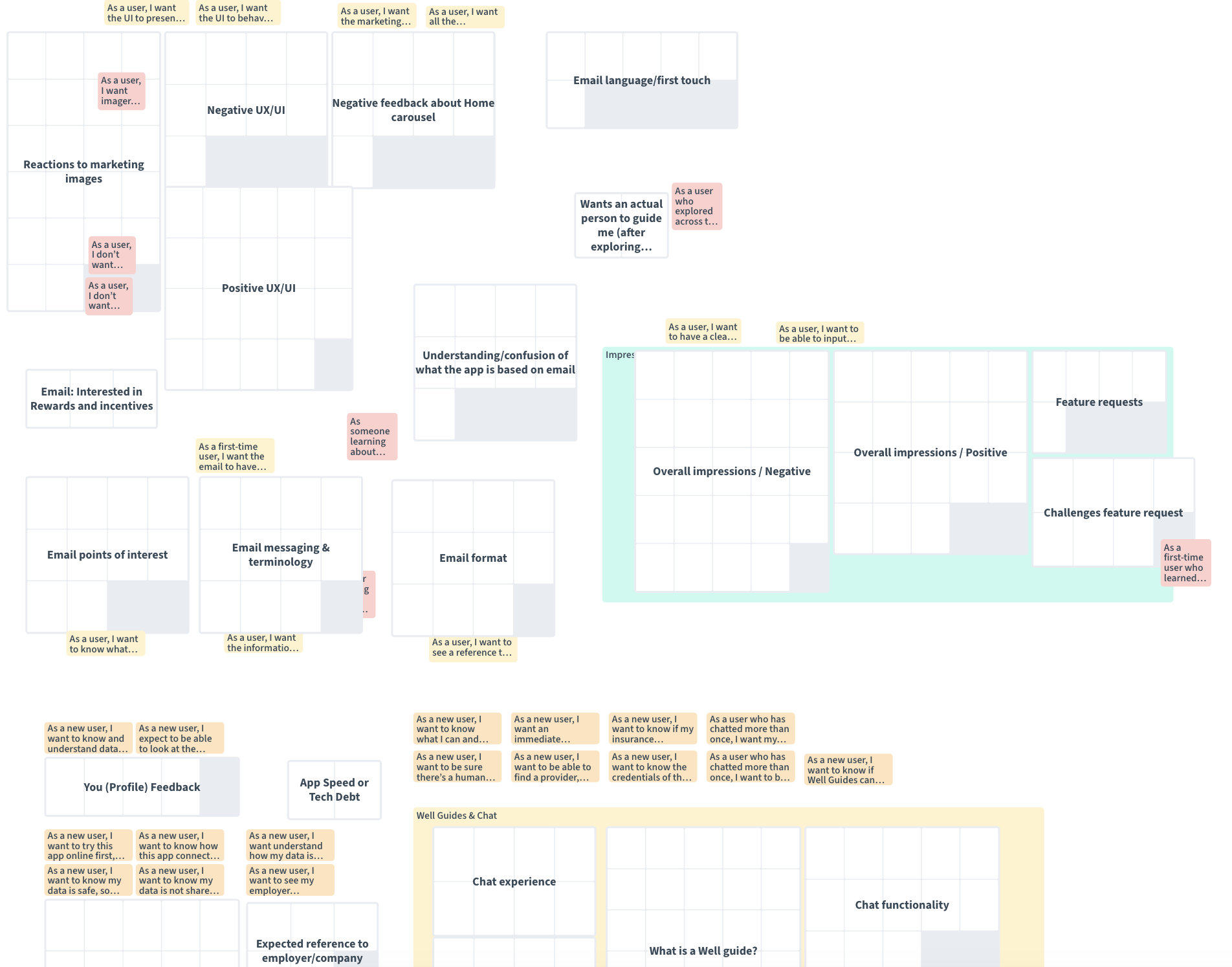 We began by grouping user quotes into categories to expose overarching themes and pain-points. From there, I had the group write out problem statements based on the these themes and dot vote to identify the ones we wanted to dive deeper into.