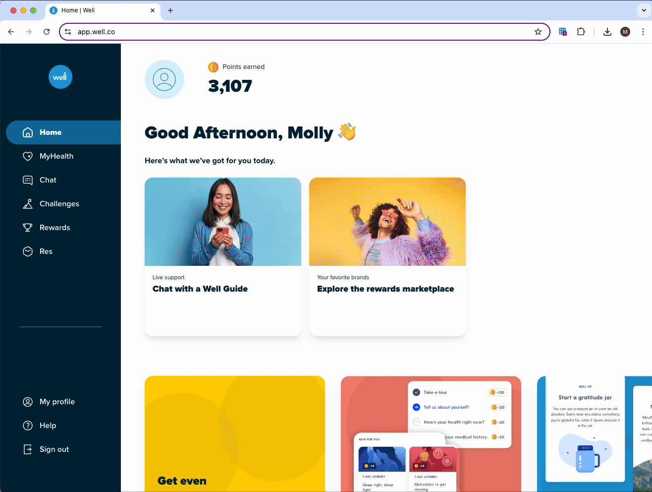 Well is a mobile-based wellness platform designed to empower users through customized guidance, daily challenges, and financial incentives for wellness engagement. Well is offered as a part of a clients’ employee health benefit package. These eligible employees receive invitations via their work email to activate their Well account.